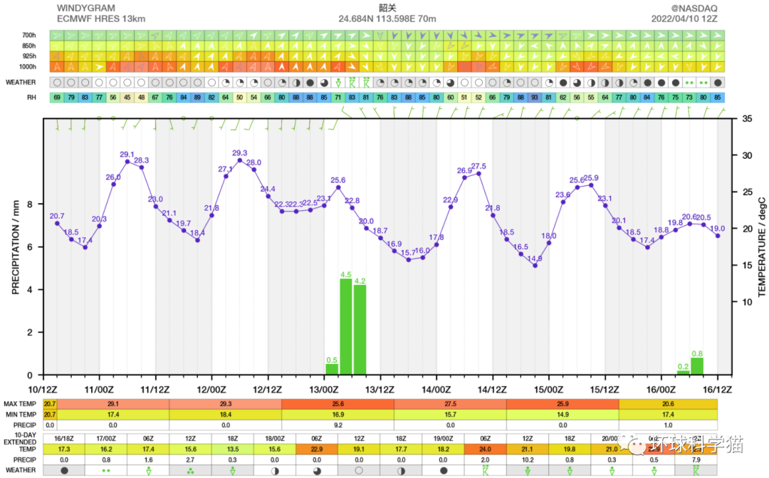 南方降温有多强呢?例如湖南长沙,在4月13日,最高气温也将从30度以上下降到20度以下,也是10多度以上,所以也不低。包括沿海地区也将出现气温的波动,例如广东韶关,也会在5度左右的气温下滑,后续可能会更强一点,回归到20度左右的可能性都有。