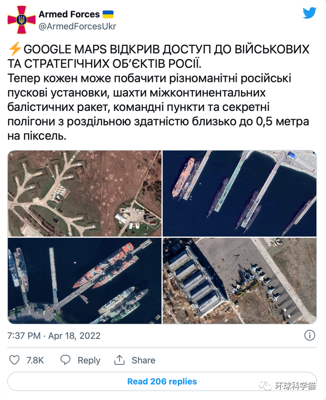 2022年4月18日,乌克兰媒体爆料称谷歌地图公开所有俄罗斯军事设施高分辨率图像。但谷歌方面回应称,并未对俄罗斯卫星图像的审查方式做出任何改变。这否认了乌媒的报道。