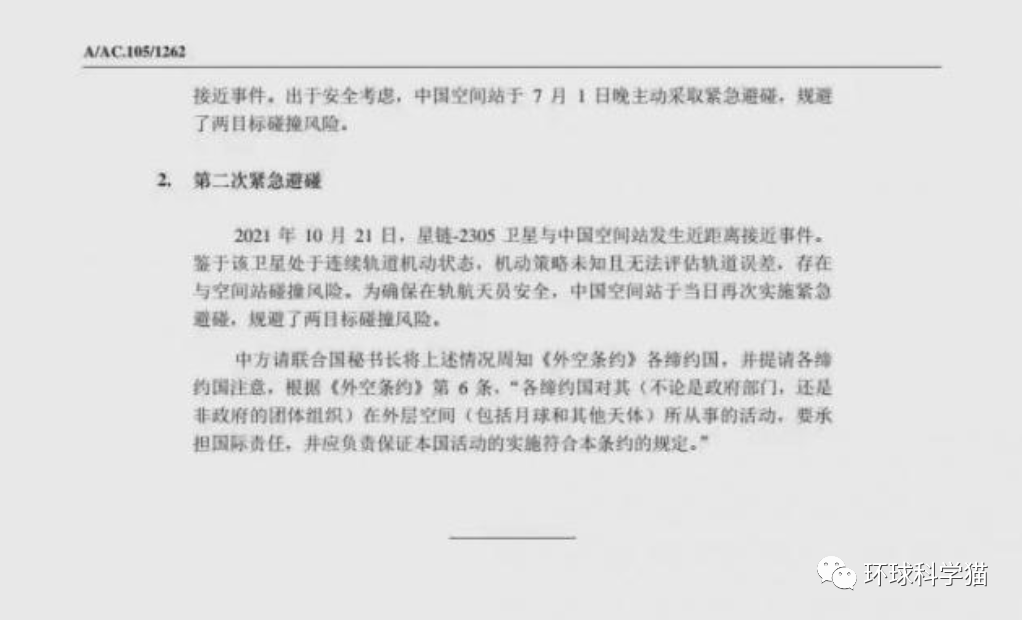 这两颗星链卫星分别为“星链-1095卫星”、“星链-2305卫星”。虽然在这个事件之后,美国发给联合国外层空间事务办公室的照会中,否认了中国关于星链卫星两次危及中国空间站安全的说法。