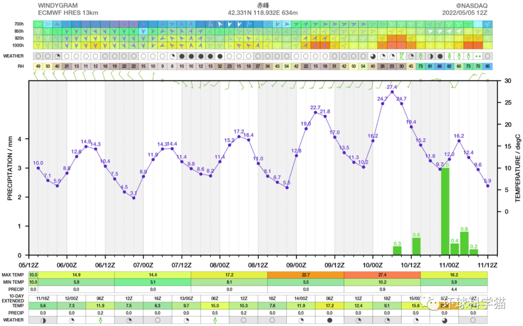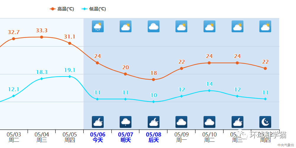 例如,内蒙古赤峰,到5月8日的时候,最高气温将从前面的31.4度下降到16度,这降温强度更大。这就是大概的情况。
