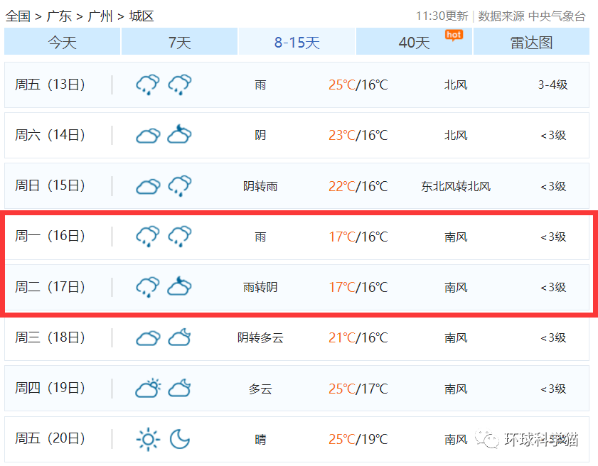 而广州到了5月16日,17日的时候,最高温度也仅17度,最低回归16度!