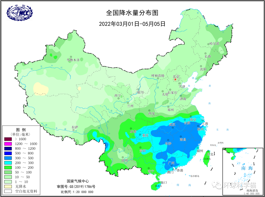 所以,南方的降雨量在春季以来是非常明显的。而北方就不一样了,在长江以北大范围地区的累积雨水量也只有10到50毫米最为明显,只有东北部分地区可达到50毫米到100毫米,所以整体上是少雨的情况。
