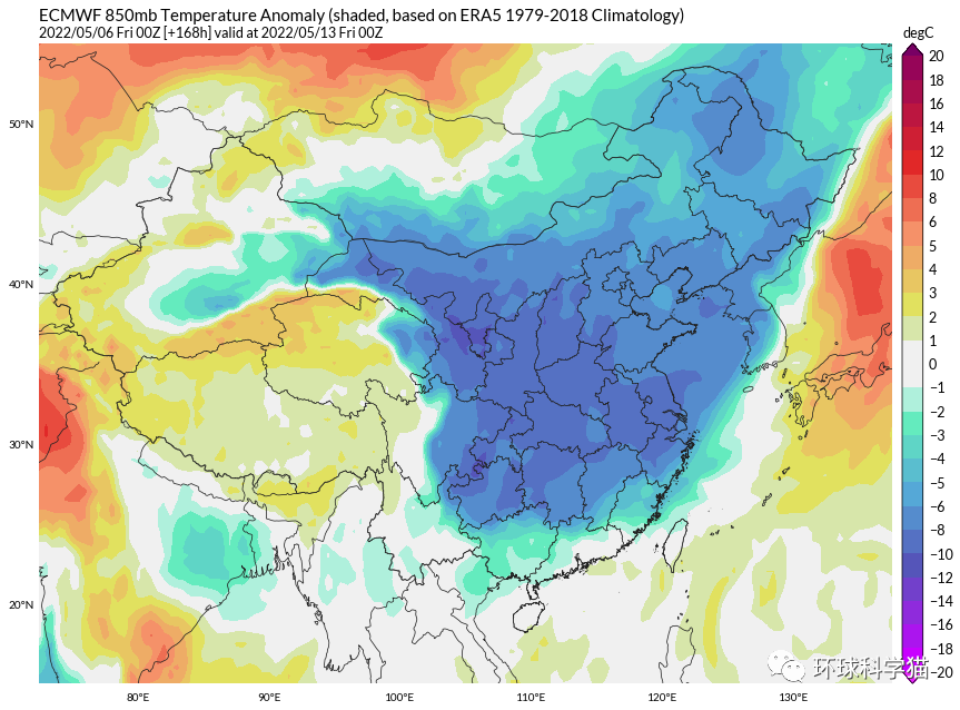 在5月11日进入东北,内蒙古中部等地的时候,还出现了“紫色冷区”,而随着冷空气的进一步增强。到了5月13日的时候,我国南北大范围地区已经彻底走进了降温圈。