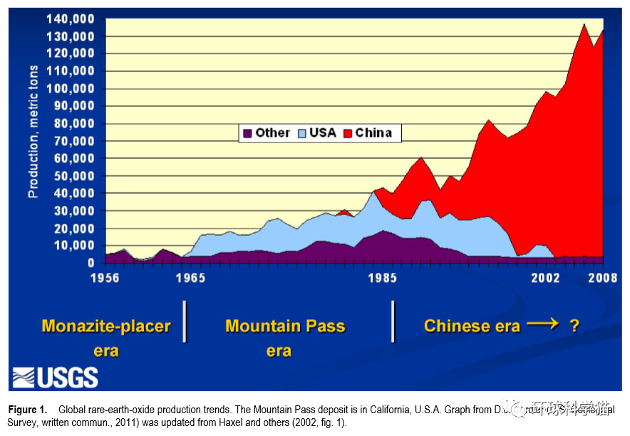 全球稀土氧化物生产趋势图,1956年-2008年 (美国地质调查局)