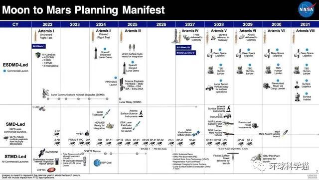 第一、在2019—2024年计划实施五次任务,其中的阿尔忒弥斯1号为无人试验飞船,阿尔忒弥斯2号将进行载人环月飞行,阿尔忒弥斯3号将在月球南极的载人着陆。