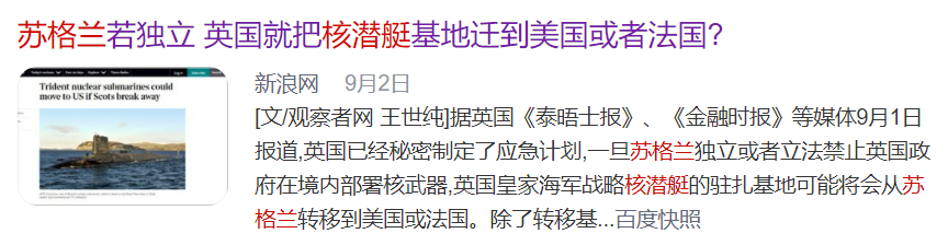 此前据英国《金融时报》报道,若苏格兰独立,英国或许把核潜艇基地迁移到美国或法国。