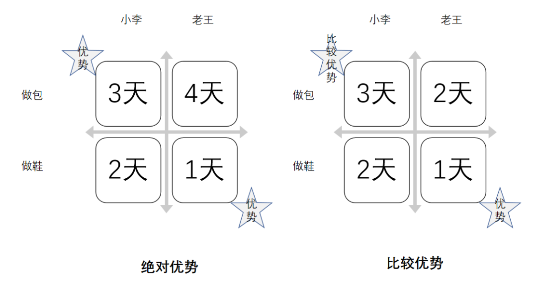 此时,小李在做包上有优势(3天对4天),老王在做鞋上有优势(1天对2天)。