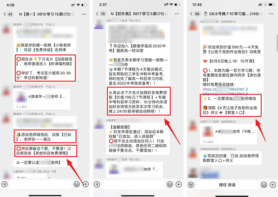 为了照顾到用户的学习体验,助教老师发完群公告会附上温馨提示,提前告知群内用户把群消息屏蔽并置顶。有的还会教用户设置微信关闭“群聊添加”,避免用户被群内其他人(竞品)添加。