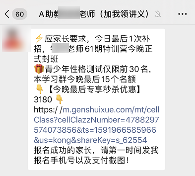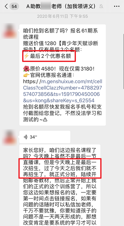 比如助教老师会继续私聊用户,课程只剩下最后 2 个优惠名额,并表示今天是最后一次招生,过了今天之后就不再招生。