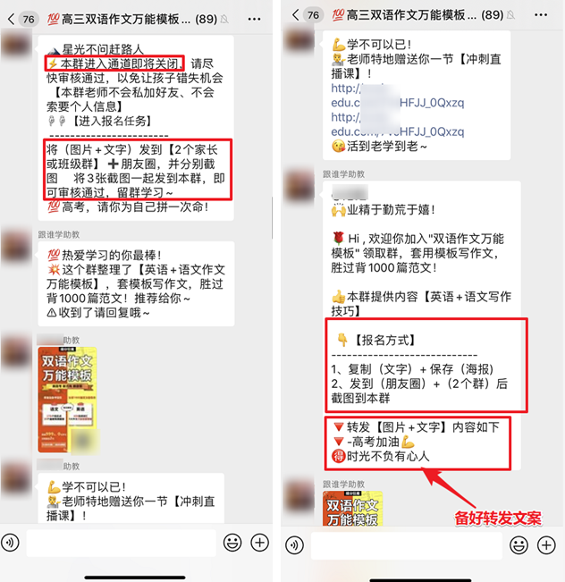 能让这么多公众号、社群之间相互作用,其实还得益于「跟谁学」的引导文案。「跟谁学」的引导文案条条吸睛,直戳要害,颇有拼多多的味道。