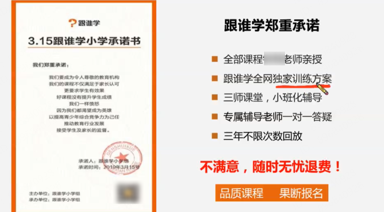 比如讲师会展示平台承诺书,让用户不用担心学了没效果。告诉大家可以先下单,对课程内容不满意可以随时退掉,有多少节课没上就可以退多少节的钱。