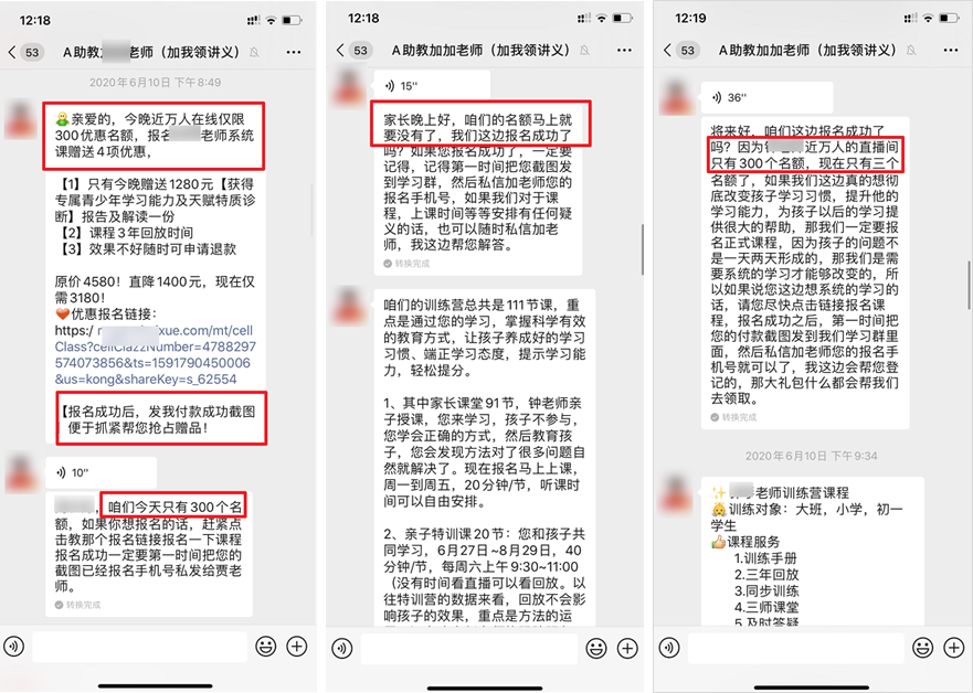 20 分钟后,用急促的语音消息告诉用户,300 个名额只剩下 3 个了,再不买就没有了。