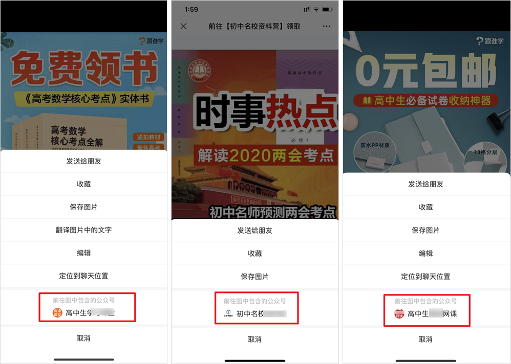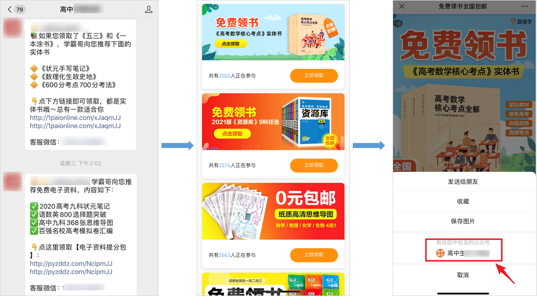 当你首次关注跟谁学的公众号或者进入到它的社群后,就会接收到类似“0元领书、衡水九科状元笔记、高考“偷分”技巧、高考作文满分模板、时事热点”等消息让用户“上钩”。