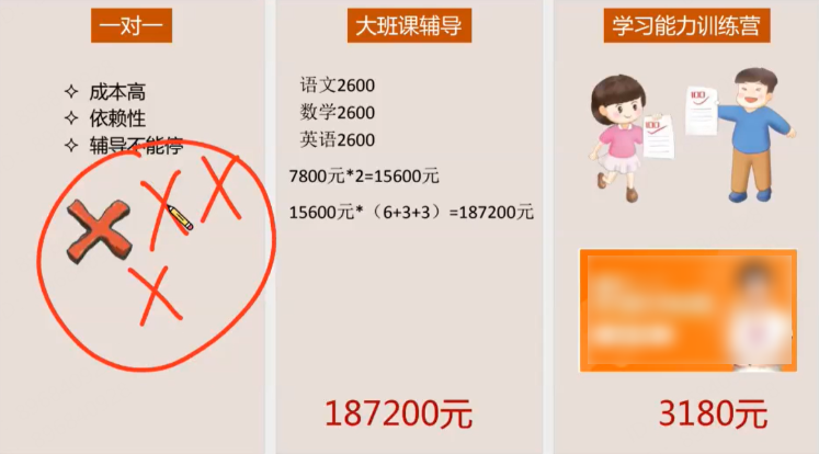 对比课程优势之后,讲师会帮用户算账,3200 报名课程费用都可以做什么,买了课程不过是少买件衣服少买一套化妆品、少出去玩一次,换来的是孩子的成长……