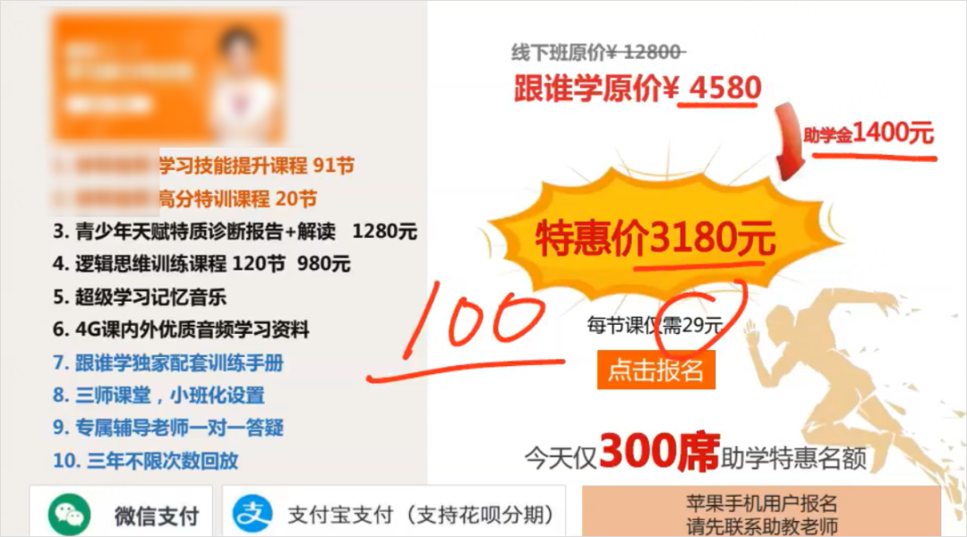 在直播课程快要结束的时候,助教老师私聊用户,说直播课程有超过万人在线,但是优惠名额只有 300 个,快来抢。