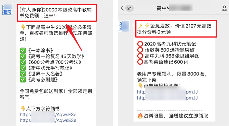 紧接着,公众号会继续推送类似“有人@你、紧急发放”等文案,不断吸引用户注意力。