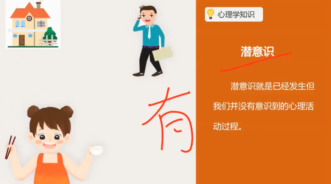举个小例子大家一起感受下,比如讲师在解释“潜意识”的时候,为了方便用户的理解,会结合吃饭、走路两种大家都习以为常的动作配合解释。