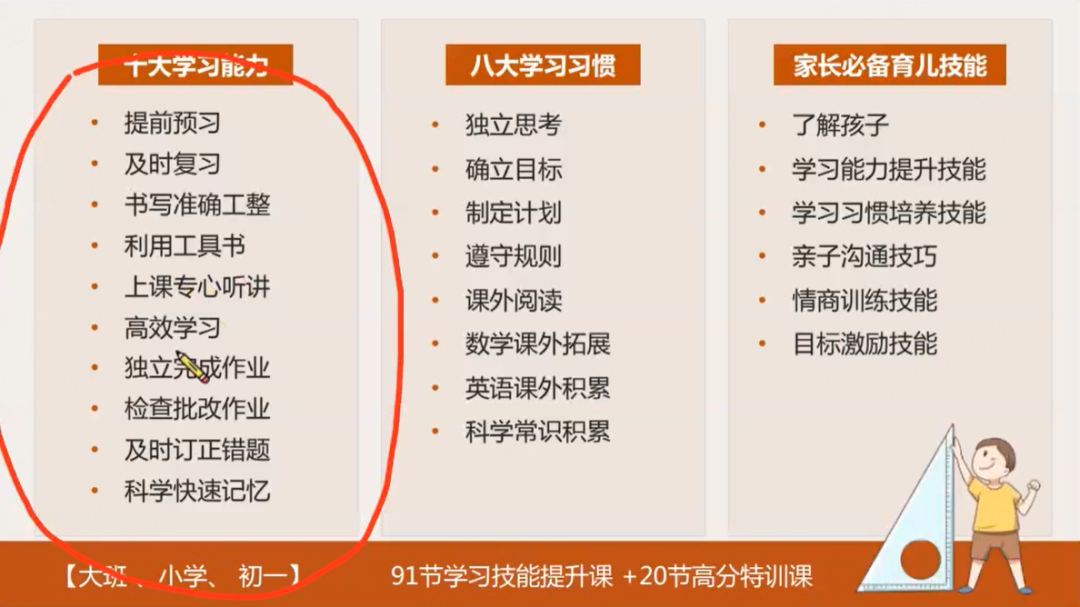在科普完心理学知识后,讲师会一一给出解决方案,并且盘点了孩子想要提升,必须具备的 10 大学习能力、8 大学习习惯,以及家长必备育儿技能等。