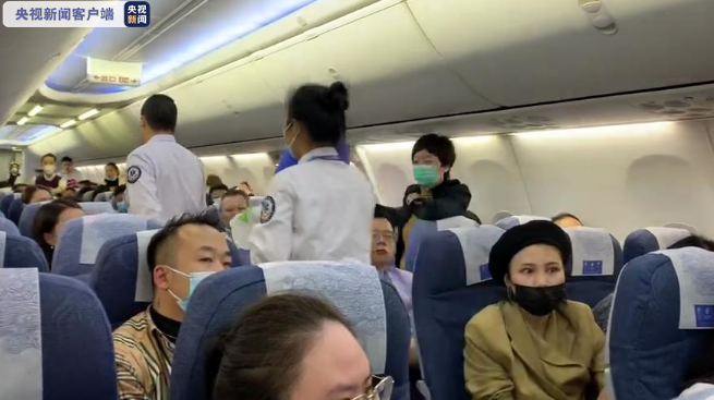 0时30分,医护人员登上飞机为乘客治疗。来源:央视新闻客户端