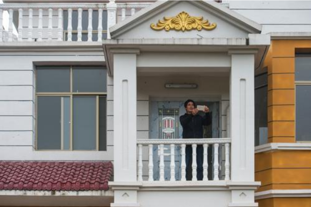 (资料图片)易有德的父亲易学仁站在自家楼上用手机拍摄记录乡村变化。记者胡九思 摄