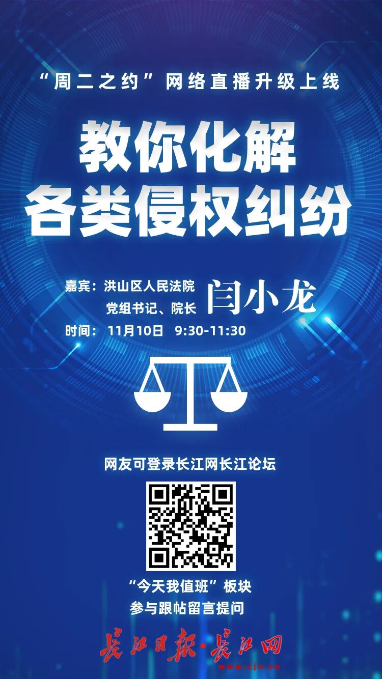 ◇ 10日上午,武汉市洪山区人民法院党组书记、院长闫小龙将做客长江日报“周二之约”直播间, 教你化解各类侵权纠纷。