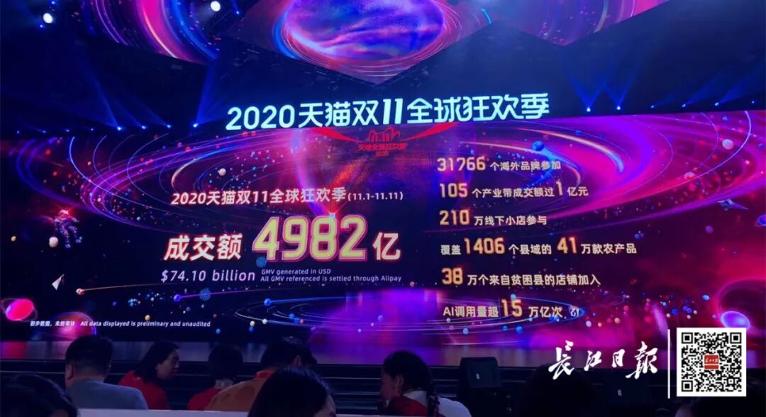 2020天猫双11全球狂欢季新闻中心大屏幕数据。记者张珺 摄