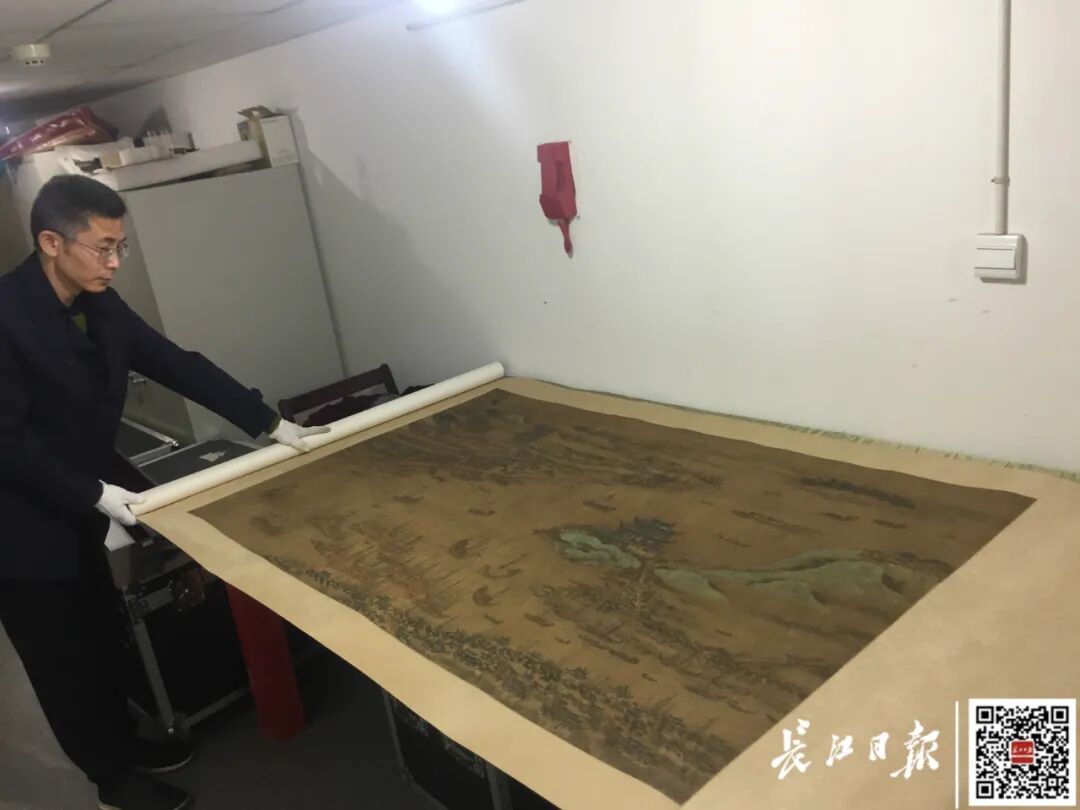 武汉博物馆保管部主任夏建在库房展示明《江汉揽胜图》。记者万建辉 摄