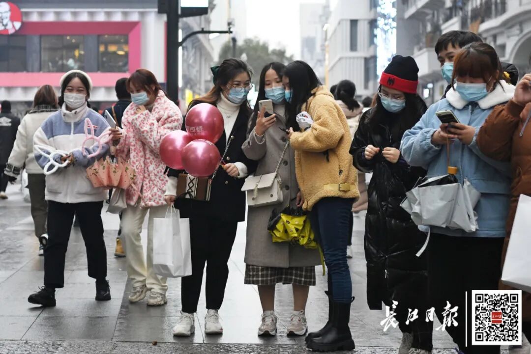 28日,江汉路步行街上寒风阵阵,不少市民身着厚实冬装逛街。记者苗剑 摄