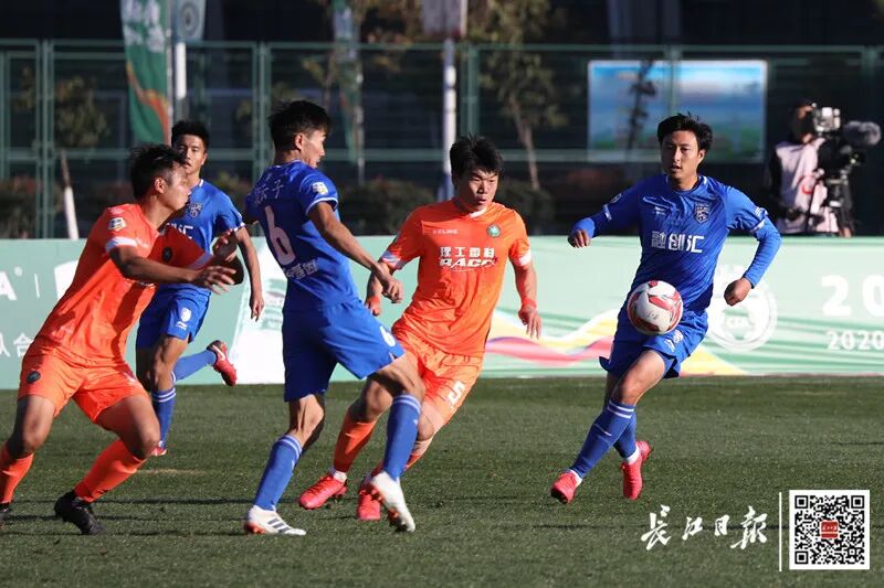 武汉三镇球员在与北京理工的比赛中奋力拼搏。记者马万勇 摄于昆明