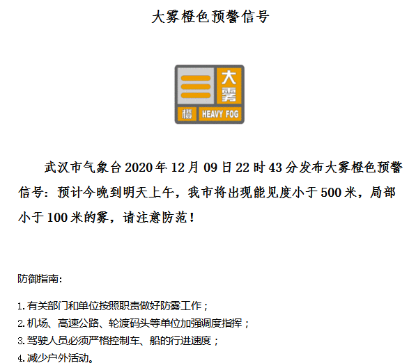 ◇ 武汉今年入冬以来首次发布大雾橙色预警。