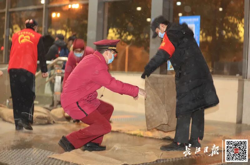 13日晚,楚河汉街地铁口,工作人员及时铺设防滑垫。