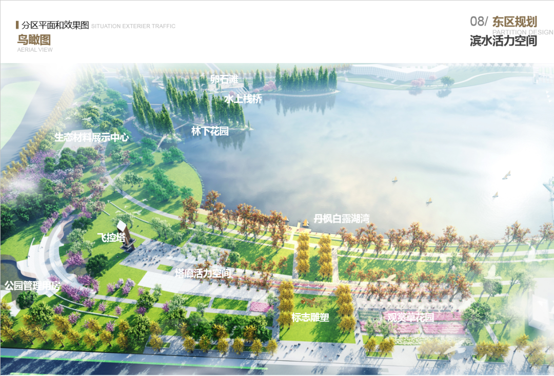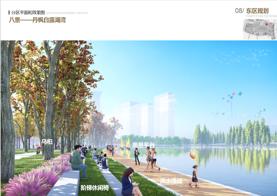 滨水活力空间,主要有丹枫白露湖湾和塔廊活力空间两大景点,以活力、艺术为主,展现现代的城市空间氛围。