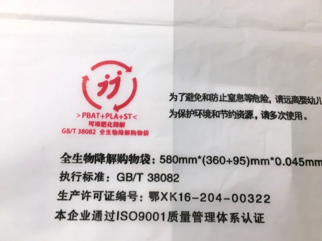 新环保全生物可降解塑料袋上红色可降解标志。 记者戴红兵 摄