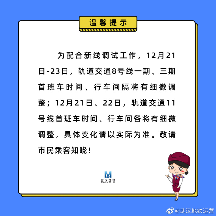 ◇ 武汉地铁新线调试,8号线、11号线运营时间有微调。