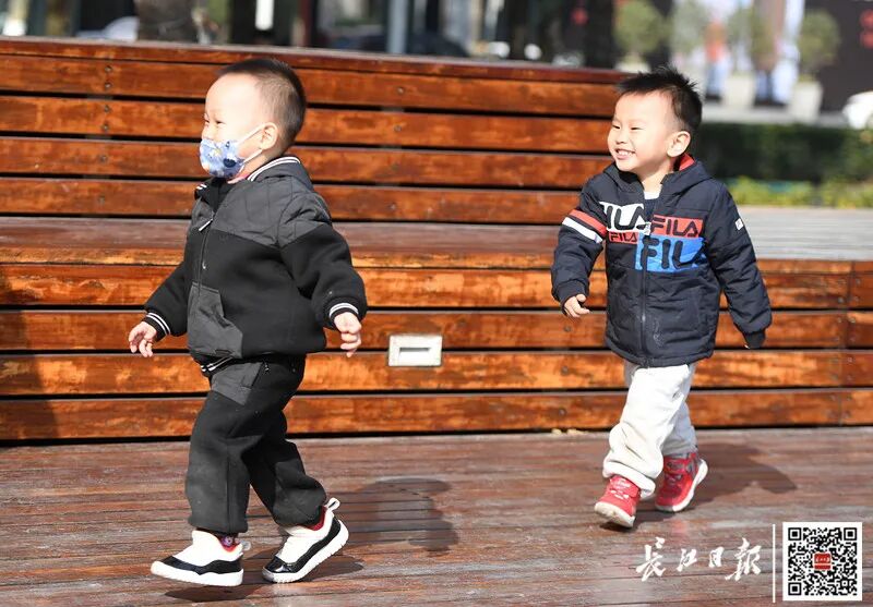 市民来到武汉天地广场晒太阳、遛娃。记者周超 摄