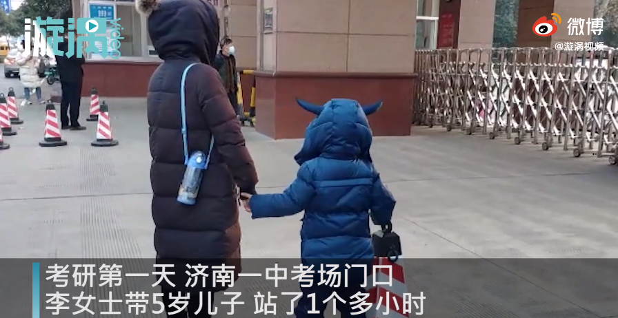 26日,济南第一中学门口,李女士带着5岁儿子在考场外感受考研的氛围。李女士称,孩子还有16年,大约5840多天就要考研了,带孩子过来是让他感受考试氛围,这对孩子成长是有帮助的。
