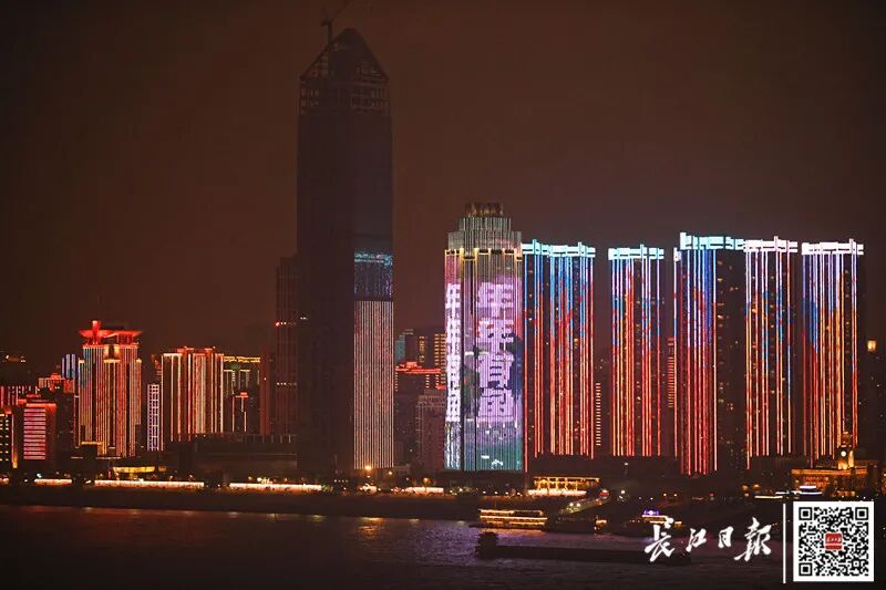 ◇ 29日,“长江十年禁渔”灯光秀开启,武汉长江两岸高楼上轮流打出宣传语。
