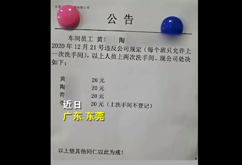 近日,网友发帖称东莞一公司多名员工连上2次厕所被各罚20元。该企业员工上厕所要登记,且每个班只允许上一次。公司经理称,员工经常躲厕所抽烟、玩手机,多次谈话仍不改,只是警告没有扣钱。