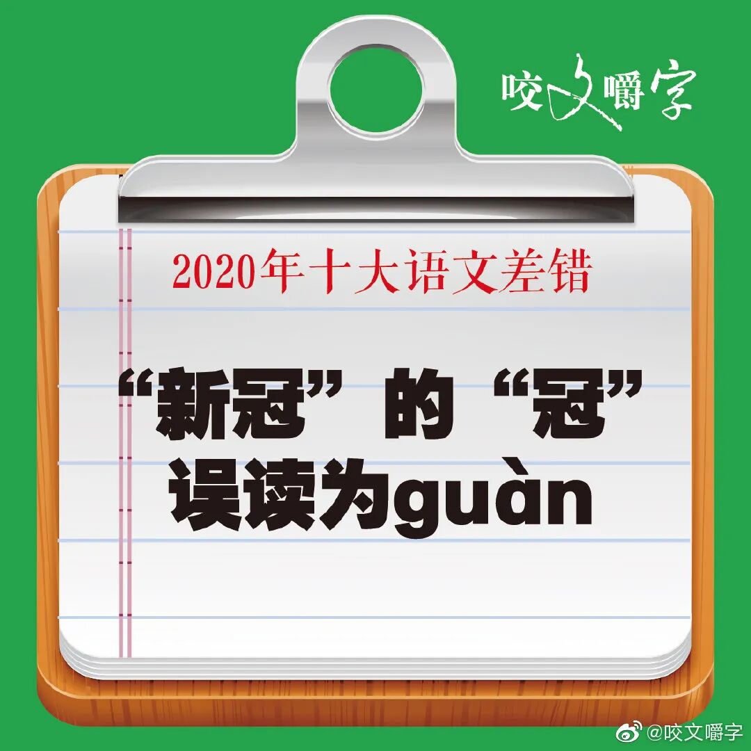 5日,《咬文嚼字》编辑部公布2020年度“十大语文差错”。其中包括“新冠”的“冠”误读为guàn、“戴口罩”误为“带口罩”、“共渡难关”误为“共度难关”“科创板”误为“科创版”、“螺蛳粉”误为“螺丝粉”等。详见>>>