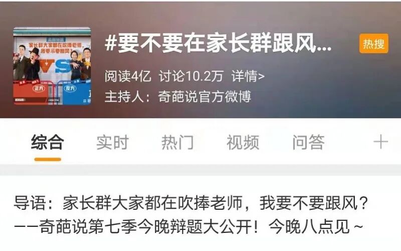 近日,“要不要在家长群里跟风吹捧老师”引发网友广泛讨论,并迅速登上微博热搜,阅读量超过4亿。你怎么看?