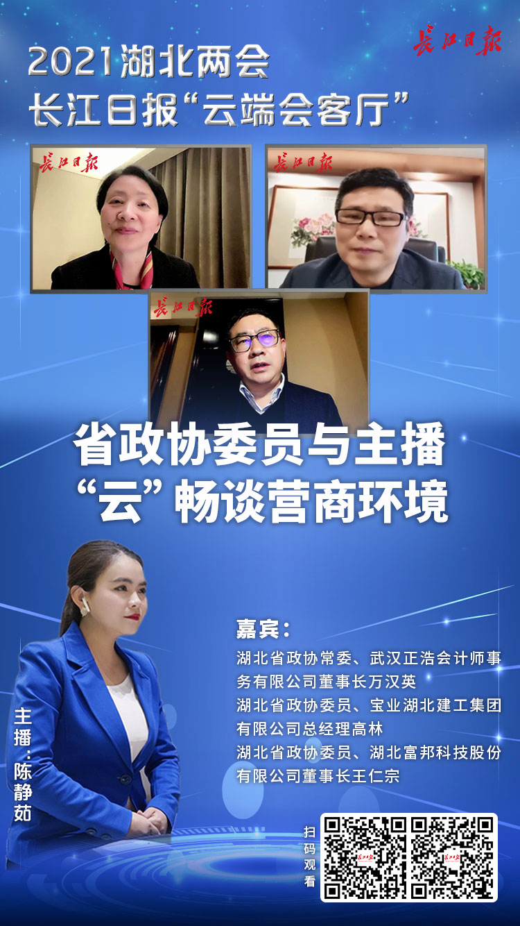 湖北省政协常委、武汉正浩会计师事务有限公司董事长万汉英,湖北省政协委员、宝业湖北建工集团有限公司总经理高林,湖北省政协委员、湖北富邦科技股份有限公司董事长王仁宗作为嘉宾做客直播间,与主播“云”互动,畅谈“优化营商环境”。
