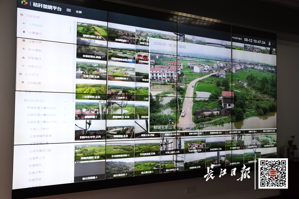 武汉市生态环境局新洲区分局秸秆禁烧智能视频监控系统终端大屏。记者戴红兵 摄