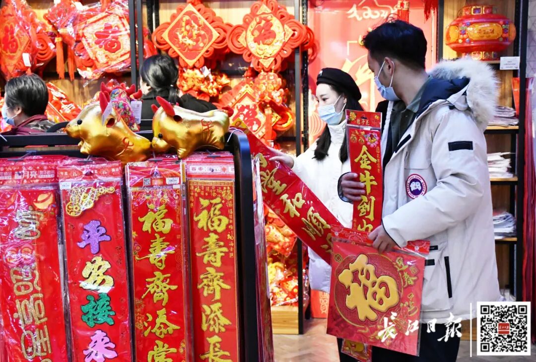 6日,武商超级生活馆的新年饰品区,各种牛年玩偶、中国结、春联摆满了货架。市民在这红红火火的气氛里开心地选购商品,让这个牛年过得火热起来。记者詹松 摄