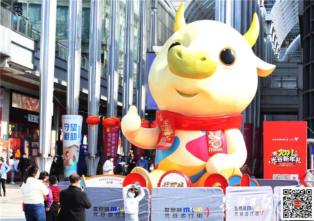 光谷步行街,市民们在六米高的吉祥物“小昂”前拍照留念。记者 高勇 摄