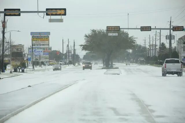 2月15日,在美国得克萨斯州休斯敦,车辆在积雪的道路上行驶。图片来源自新华社