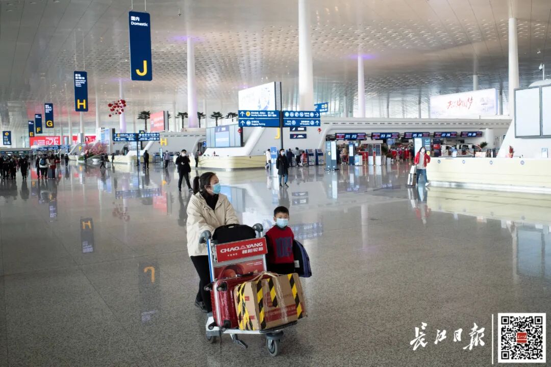 16日,在武汉天河机场,返程的旅客陆续增多。记者任勇 摄