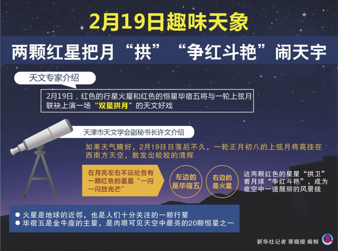 ◇ 19日,红色的行星火星和红色的恒星毕宿五将与一轮上弦月上演“双星拱月”天象。