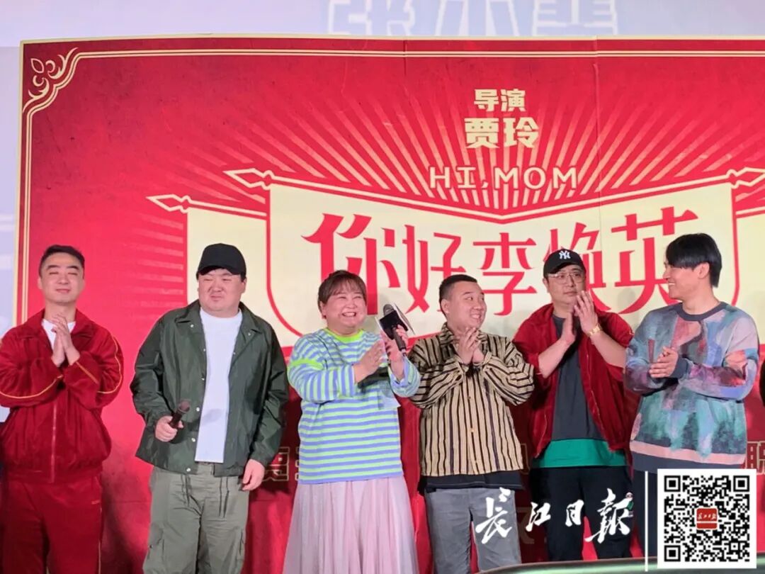 路演现场,导演兼主演贾玲(左三)携片中演员和观众互动。记者钟磬如 摄