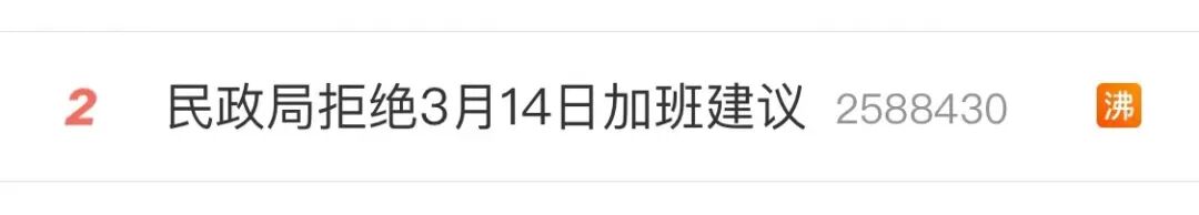 根据《市人民政府办公厅关于全市部分公共服务窗口延长服务时间的通知》,全市各婚姻登记处均增加了周六延时服务,延时服务期间的工作时间为9:00—16:00。3月14日为周日,是各婚姻登记处每周唯一的法定休息日,暂时没有加班办理婚姻登记的计划。