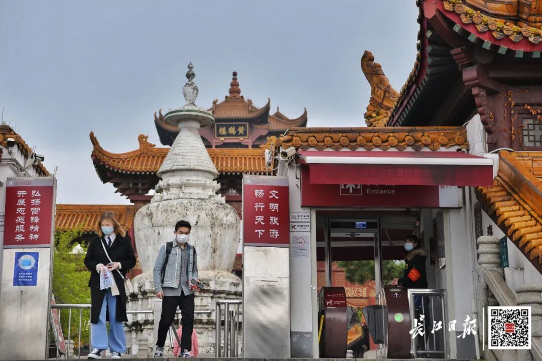 11日,武汉黄鹤楼公园,游客扫行程健康码、测量体温、凭免费预约短信进入景区游览。记者苗剑 摄
